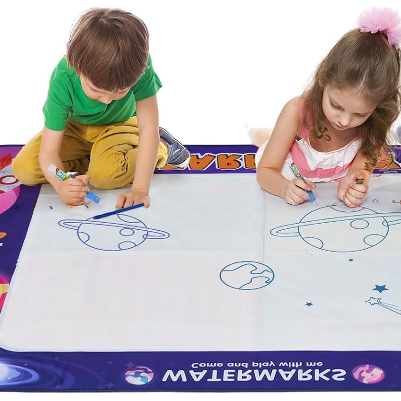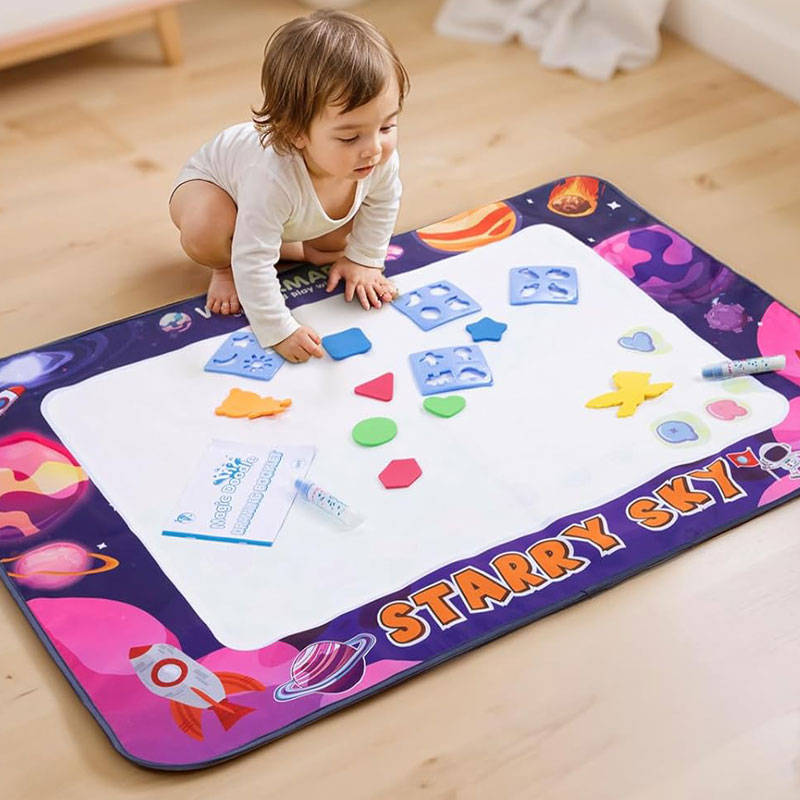 سفره جادویی نقاشی با آب طرح آسمان پر ستاره کد YL1022-51A برند SobeBera یک بوم نقاشی بزرگ است که بر روی زمین پهن میشود و امکان نقاشی را تنها با آب و بدون هیچ کثیفکاری به کودکان میدهد. برای استفاده کافیست قلم آبرنگ جادویی آن را با آب پر کنید و نوک آن را روی پد بکشید تا خطوط و الگوهای خود را به صورت رنگی ببینید. حتی نیاز به پاککن هم ندارید زیرا به طور جادویی پس از 3 تا 10 دقیقه وقتی آب خشک شود، نقاشی محو میشود (بسته به دما و جریان هوا) و میتوانید دوباره شروع کنید. یعنی کودکان میتوانند بارها و بارها روی این زیرانداز نقاشی کنند و از آن لذت ببرند. به همراه این سفره، 2 قلم آبرنگ، 4 شابلون با 16 شکل مختلف، 8 ابر با شکلهای مختلف مانند قلب، دایره، ستاره، مربع، مثلث و … و کتابچه نقاشی و رنگآمیزی نیز عرضه میشود.